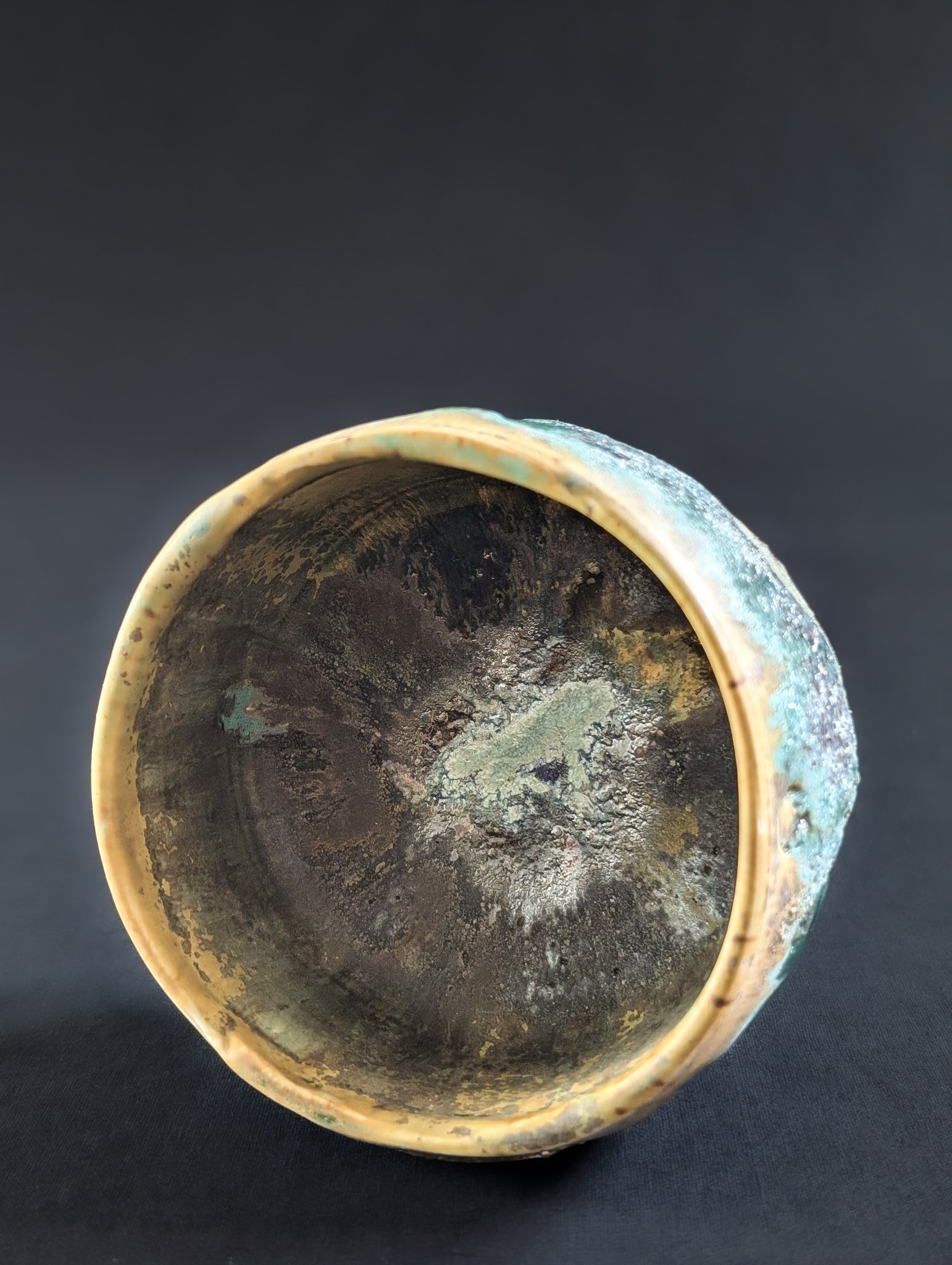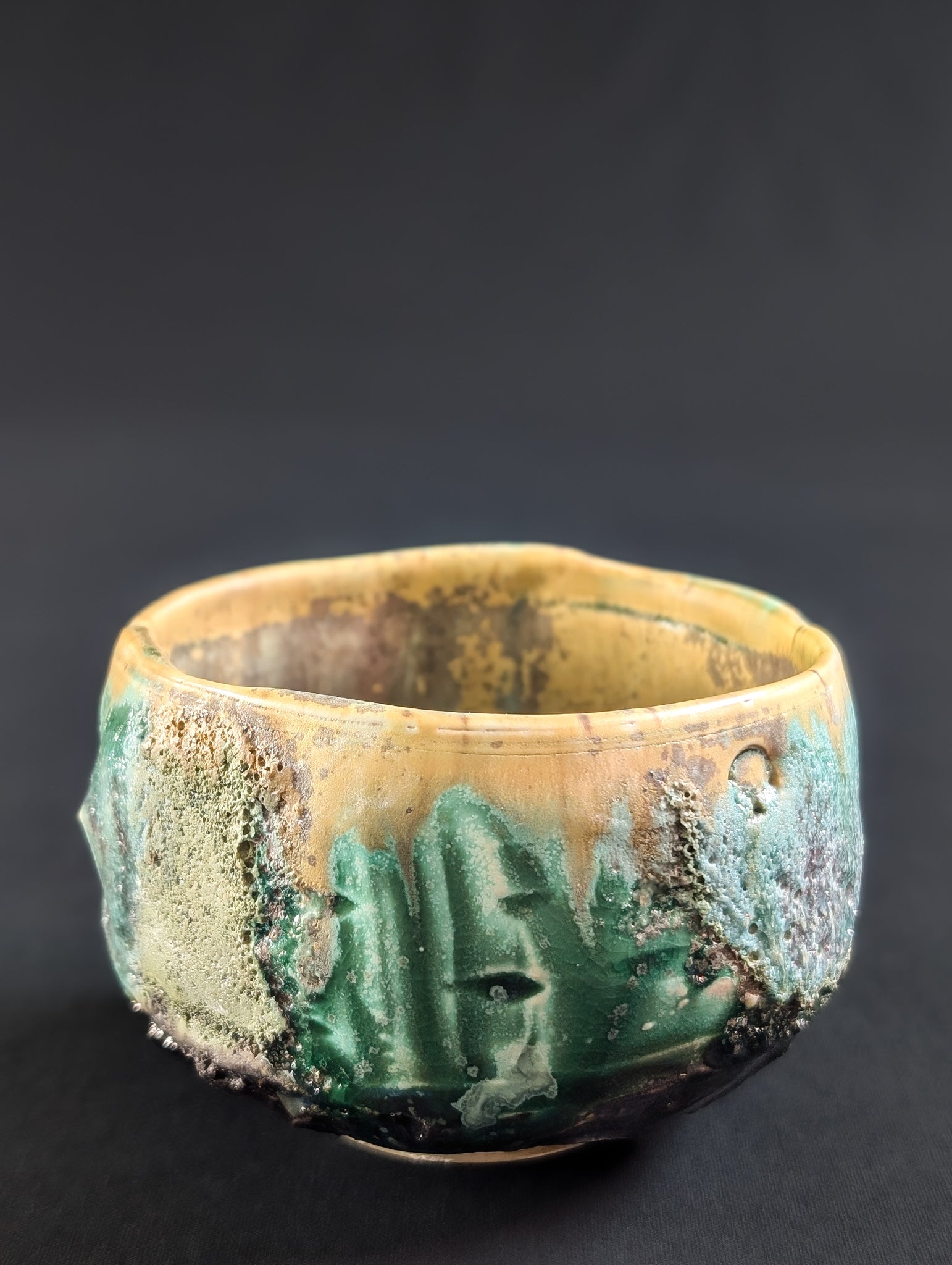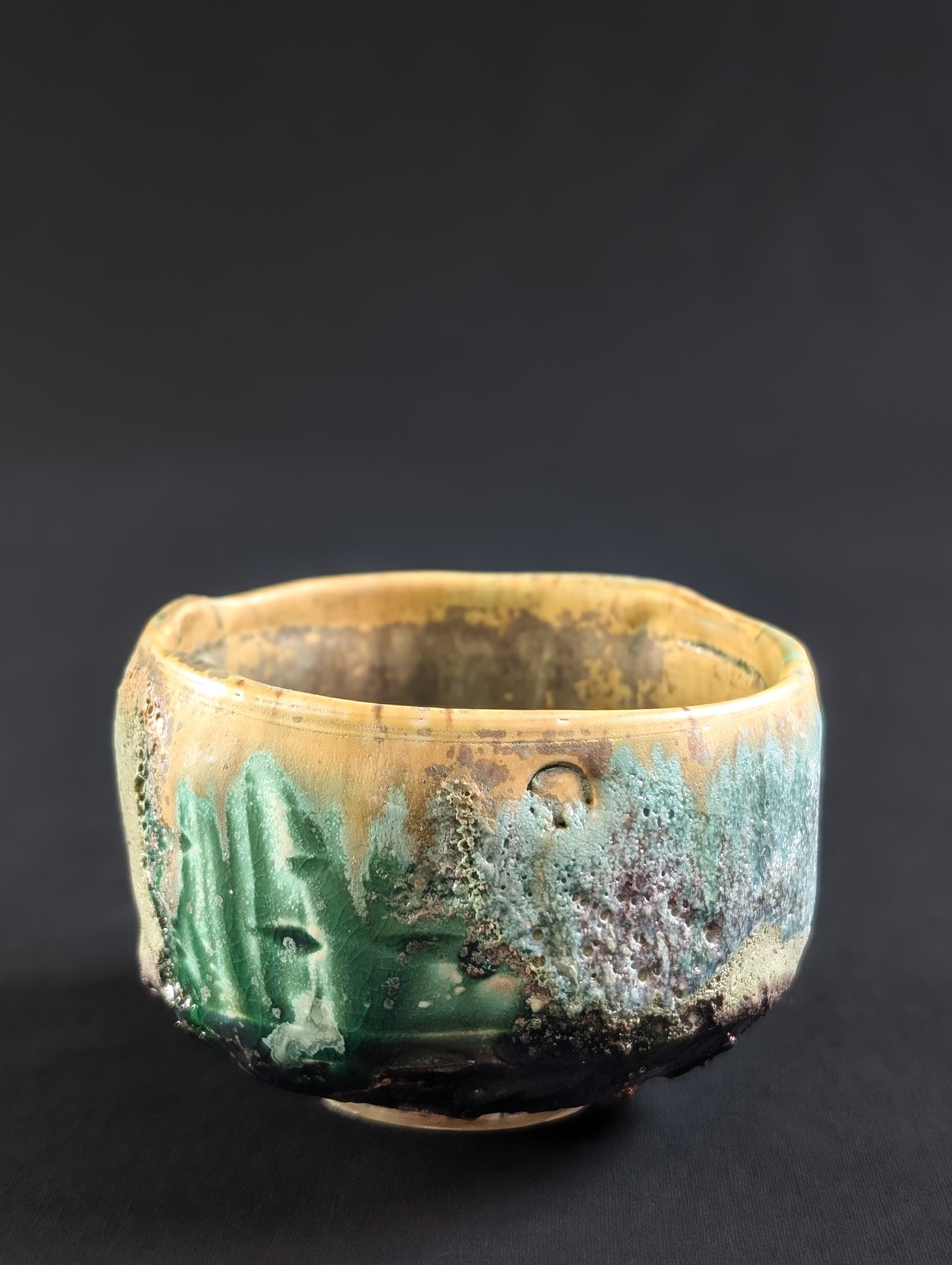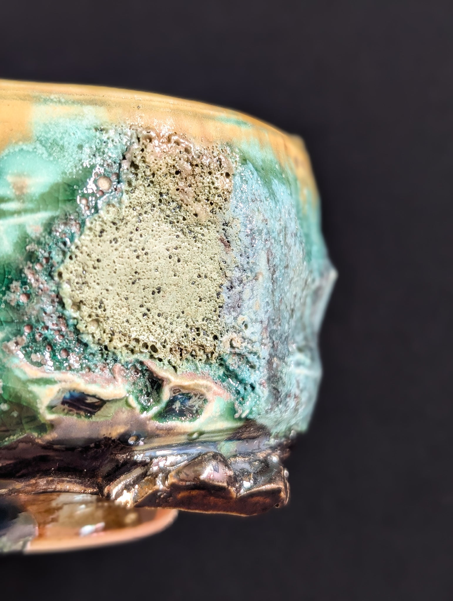 Sulfur Bloom is a study in alchemy, a chawan where glaze becomes terrain. The rim begins in matte ochre, like sulfur dust on dry stone, then drips downward into a deep emerald green with glassy depth. But it doesn’t stay there: the surface breaks open, interrupted by areas of matte, bubbled glaze, as if air once hissed from cooling rock. Yellow, green, chalk white, and pale seafoam swirl across the textured zones, like mineral growth on a cavern wall. The interior mirrors this transformation. Ochre gives way to a soft, metallic glow that deepens like tarnished bronze. Raw yet refined, Sulfur Bloom is a vessel of quiet eruption.