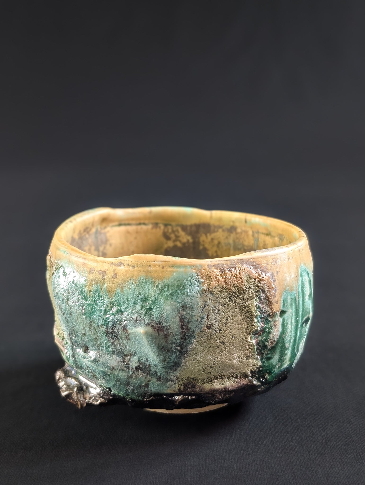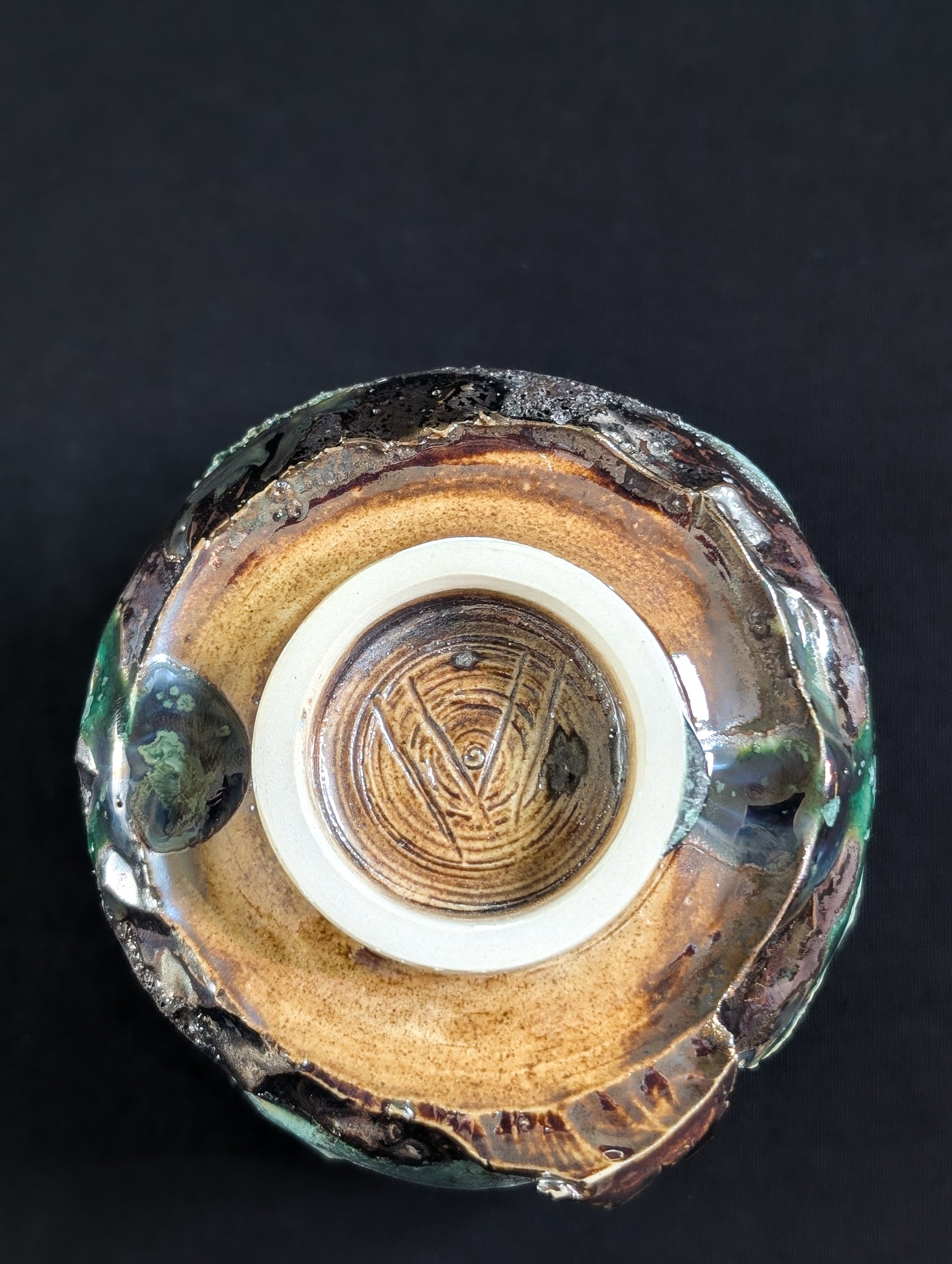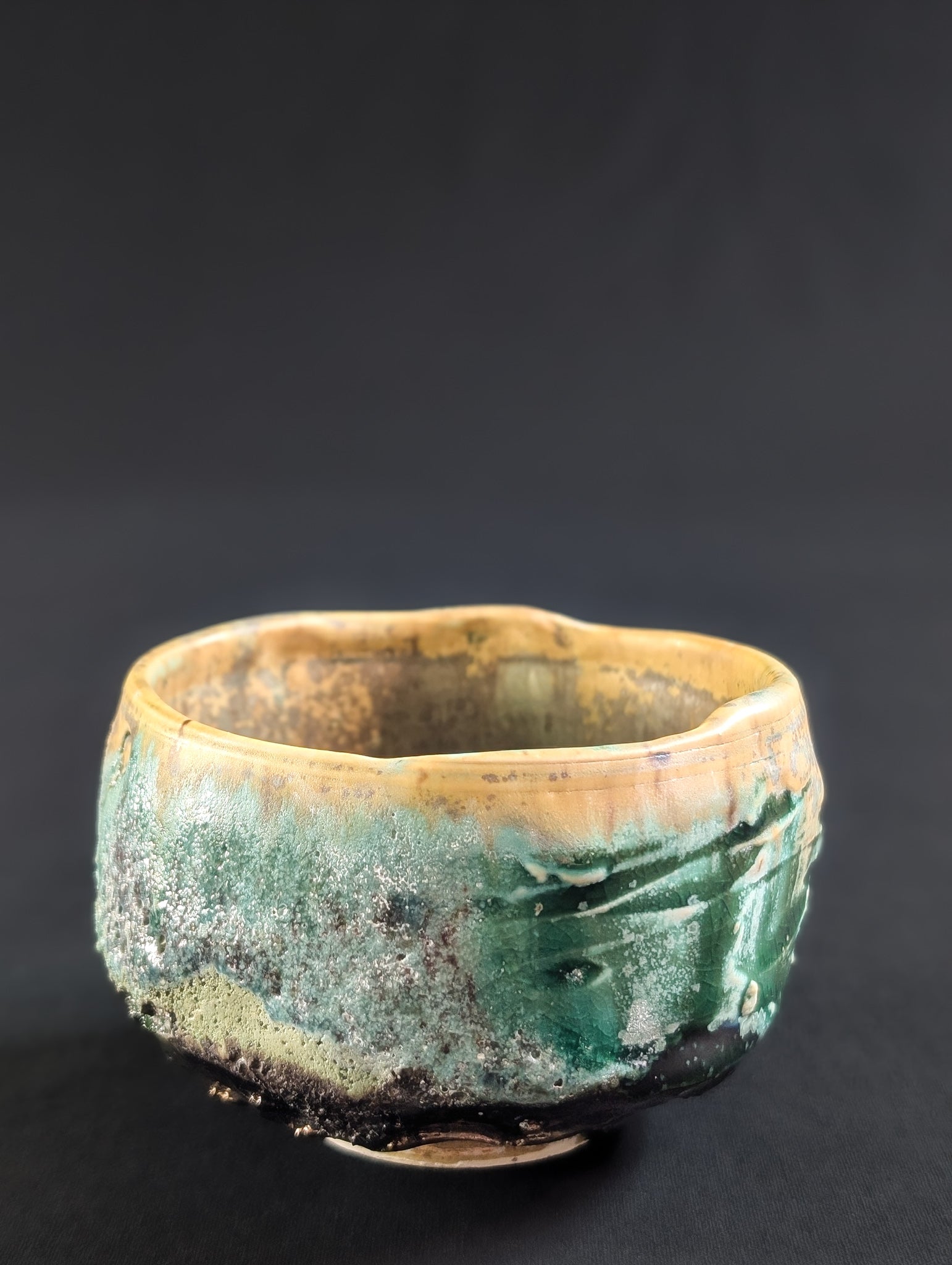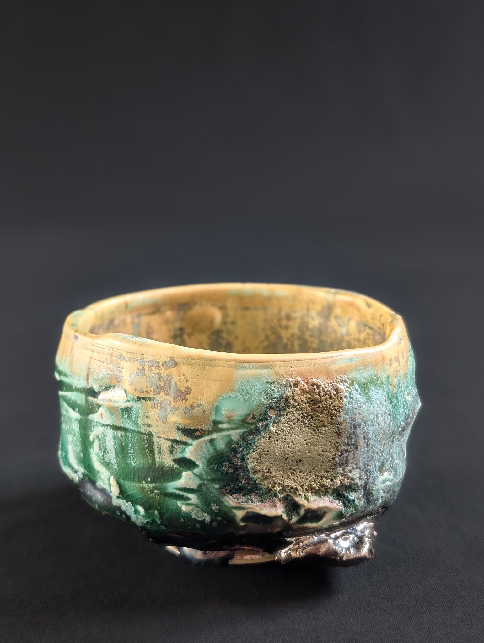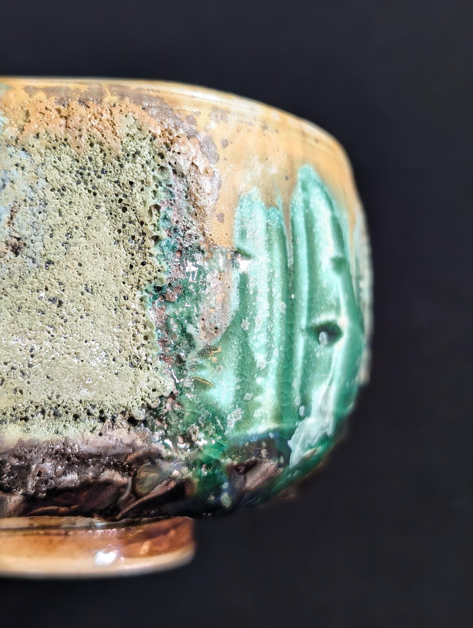Sulfur Bloom is a study in alchemy, a chawan where glaze becomes terrain. The rim begins in matte ochre, like sulfur dust on dry stone, then drips downward into a deep emerald green with glassy depth. But it doesn’t stay there: the surface breaks open, interrupted by areas of matte, bubbled glaze, as if air once hissed from cooling rock. Yellow, green, chalk white, and pale seafoam swirl across the textured zones, like mineral growth on a cavern wall. The interior mirrors this transformation. Ochre gives way to a soft, metallic glow that deepens like tarnished bronze. Raw yet refined, Sulfur Bloom is a vessel of quiet eruption.