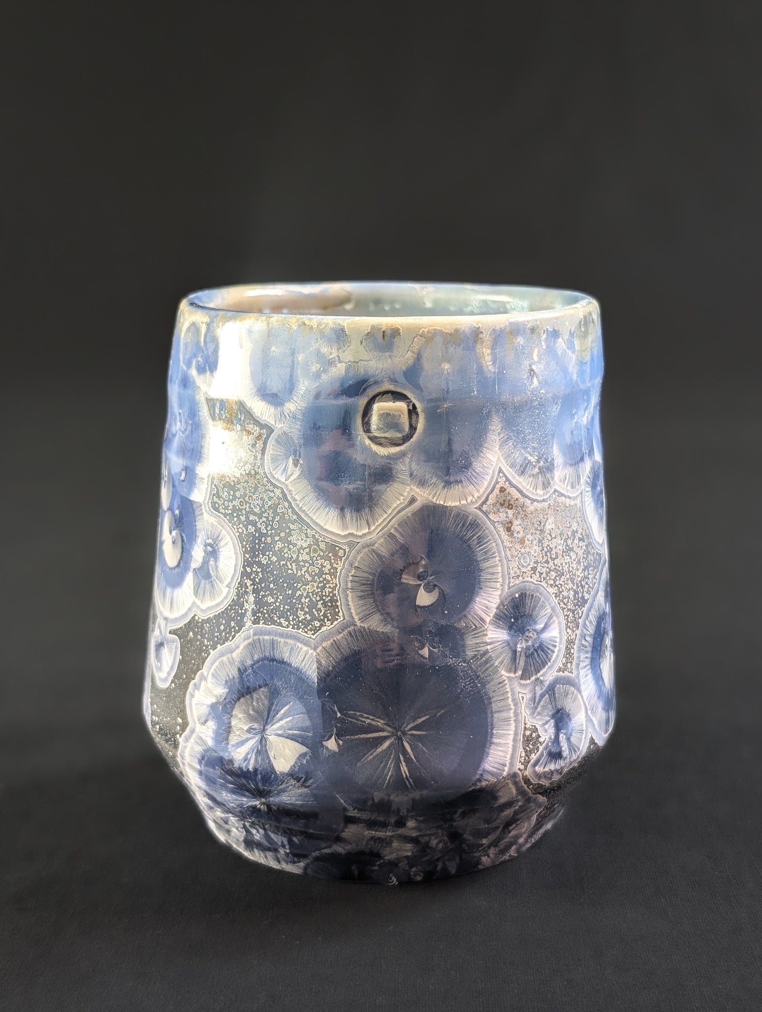 Dusk Reverie is the hush before nightfall, captured in porcelain. Its background is the inky, moody blue of a sky just after the sun slips away, a breathless moment between light and dark. Crystalline blooms in soft white and twilight blue stretch across the surface, and near the rim, golden halos shimmer like the last light catching on clouds. All around them, tiny secondary crystals scatter like the first stars of evening, soft and distant. A piece for quiet evenings and slow sips.